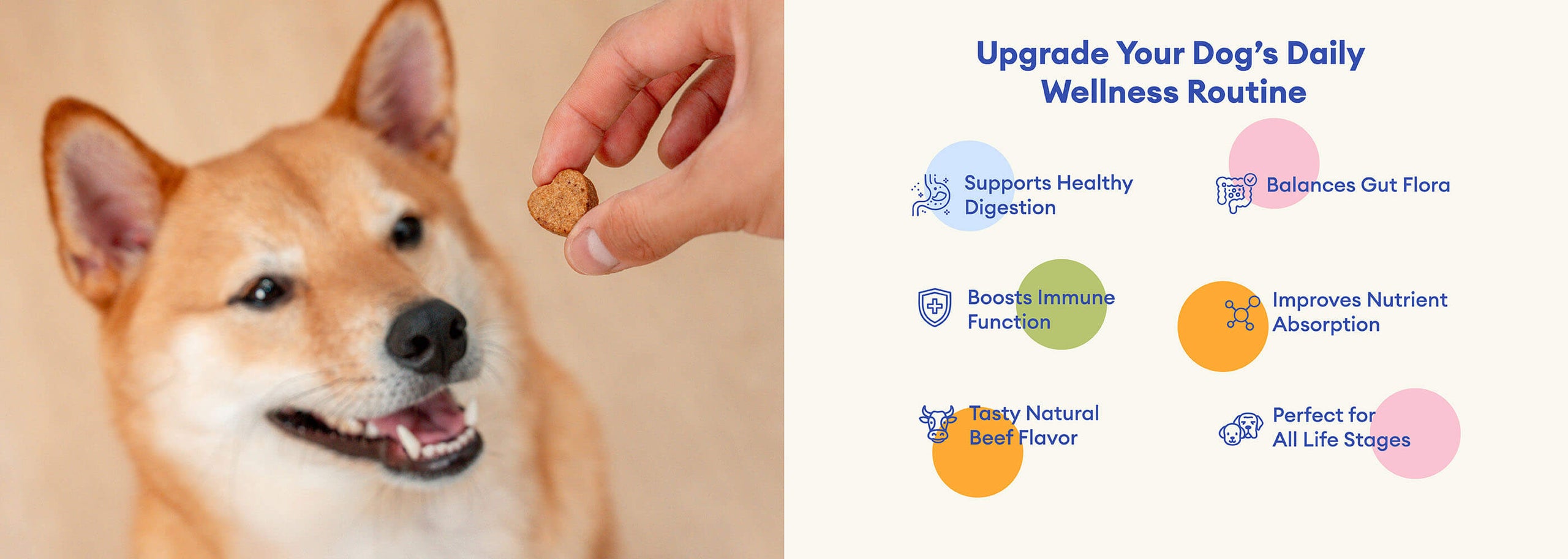 Probiotics are live, beneficial bacteria that support normal digestive function and help maintain a healthy gut and immune system. Daily supplementation can promote regular bowel movements, ease occasional loose stools, and may even support dogs experiencing seasonal allergy-related discomfort.