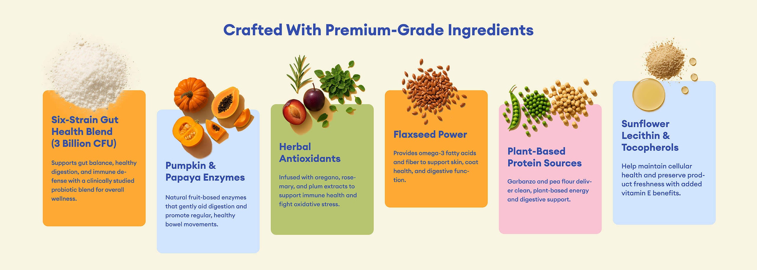 Coconut Glycerin, Flaxseed, Garbanzo Flour, Mixed Tocopherols, Natural Beef Flavoring, Natural Flavors (from Oregano, Flaxseed, and Plums), Palm Fruit Oil, Papaya, Pea Flour, Pumpkin, Rosemary Extract, Sunflower Lecithin, Tapioca Flour.