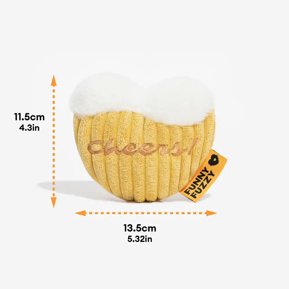 • Adorable Beer Design: Shaped like a frothy pint of beer with a cheerful “Cheers” embroidery, it adds a playful and festive vibe to your pup’s toy collection.